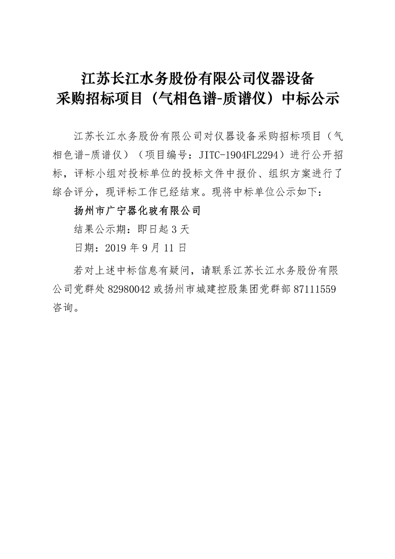 江蘇長江水務(wù)股份有限公司儀器設(shè)備采購招標(biāo)項(xiàng)目(氣相色譜-質(zhì)譜儀)中標(biāo)公示