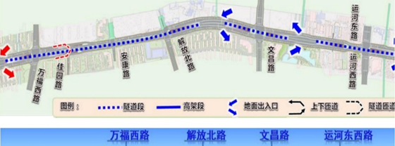 運(yùn)河南北路快速化改造工程(施井路-二里橋路南)項(xiàng)目起自二里橋路南,終至施井路北,項(xiàng)目總長(zhǎng)1440米,是整個(gè)運(yùn)河南北路快速化改造工程的關(guān)鍵節(jié)點(diǎn)工程。項(xiàng)目新建快速路雙向六車(chē)道,兩側(cè)地面輔路雙向六車(chē)道,與文昌中路、運(yùn)河西路交叉口采用下穿隧道方式穿越。其中,文昌中路隧道全長(zhǎng)470米,暗埋段83米;運(yùn)河路隧道全長(zhǎng)561米,暗埋段201米。項(xiàng)目建設(shè)對(duì)推進(jìn)揚(yáng)州城市發(fā)展、完善城市快速路網(wǎng)、緩解老城交通擁堵以及提升城市形象有著十分重要的作用。