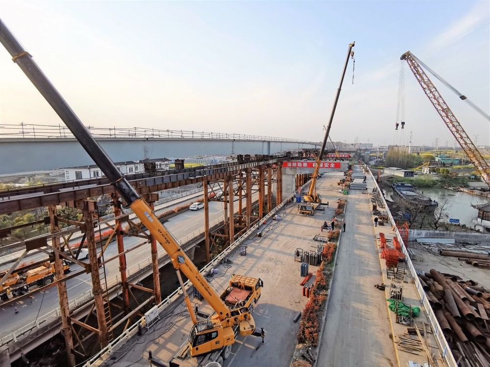 運(yùn)河南北路快速化改造二期工程(萬福西路—物港路北)全線采用高架式快速路斷面,總長2.73公里,標(biāo)段范圍內(nèi)包含運(yùn)河南北路高架、萬福路互通樞紐和全線地面道路。高架主線橋上部結(jié)構(gòu)大部分采用現(xiàn)澆預(yù)應(yīng)力混凝土連續(xù)箱梁,在運(yùn)河北路與古運(yùn)河交界處,設(shè)計(jì)在原夫差橋上方進(jìn)行施工架設(shè),平行上跨新建230米左右幅三跨連續(xù)鋼箱梁,雙向10車道,是揚(yáng)州快速環(huán)路中唯一一座平行上跨新建的“橋上橋”。其中,鋼箱梁施工采用的是搭設(shè)高空施工平臺(tái),將鋼箱梁吊運(yùn)至平臺(tái)上拼裝,然后頂推到位的方法施工。
