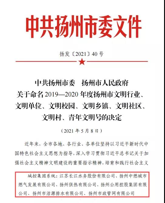 近日,市委、市政府發(fā)布《關(guān)于命名2019—2020年度揚(yáng)州市文明行業(yè)、文明單位、文明校園、文明鄉(xiāng)鎮(zhèn)、文明社區(qū)、文明村、青年文明號(hào)的決定》,城控集團(tuán)所屬江蘇長(zhǎng)江水務(wù)股份有限公司、揚(yáng)州中燃城市燃?xì)獍l(fā)展有限公司、揚(yáng)州供熱有限公司、揚(yáng)州公用控股集團(tuán)有限公司、揚(yáng)州市潔源排水有限公司、揚(yáng)州市政管網(wǎng)有限公司等6家單位榮獲“市級(jí)文明單位”稱(chēng)號(hào)。