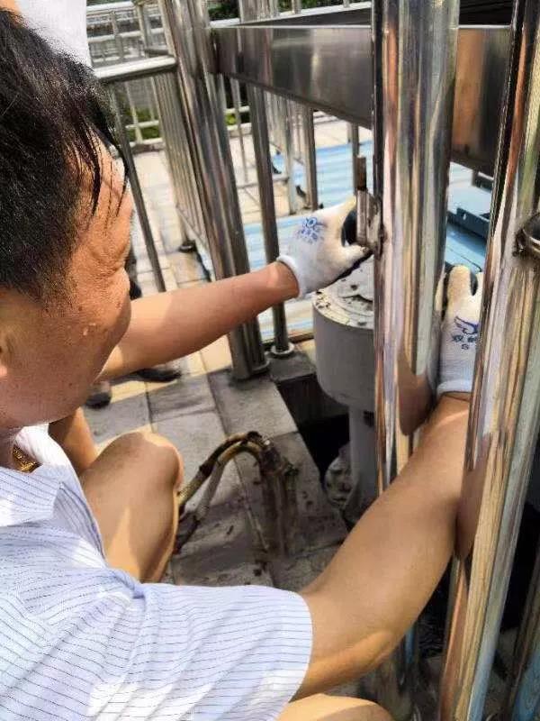 中午12點(diǎn),太陽猛烈,揚(yáng)州第四水廠機(jī)電班李軍在沉淀池進(jìn)行設(shè)備巡檢維修,此時(shí)他曬成了“大紅臉”,汗如雨下?!懊刻煲路撓聛矶寄軘Q出水,至少要換洗2套工作服?!崩钴娦χ蛉さ溃O(shè)備維修馬虎不得,哪怕是擰緊松動(dòng)的一顆螺絲、解決一絲絲的滲油,都有可能避免一場(chǎng)安全事故?!案邷靥旃ぷ鞔_實(shí)難熬,但能確保水廠的生產(chǎn)運(yùn)轉(zhuǎn),辛苦點(diǎn)也很值得。”