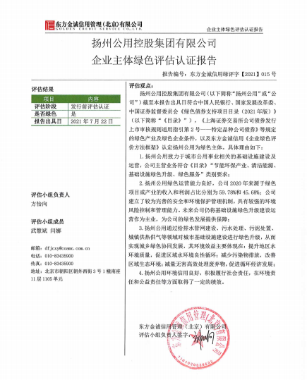 根據(jù)評(píng)估結(jié)果,東方金誠(chéng)確認(rèn)揚(yáng)州公用控股的綠色業(yè)務(wù)符合國(guó)家發(fā)展改革委等七部門發(fā)布的《綠色產(chǎn)業(yè)指導(dǎo)目錄(2019年版)》和人民銀行等三部門發(fā)布的《綠色債券支持項(xiàng)目目錄(2021年版)》要求,公司經(jīng)營(yíng)的環(huán)境表現(xiàn)、社會(huì)表現(xiàn)和公司治理的綜合綠色化程度較高。