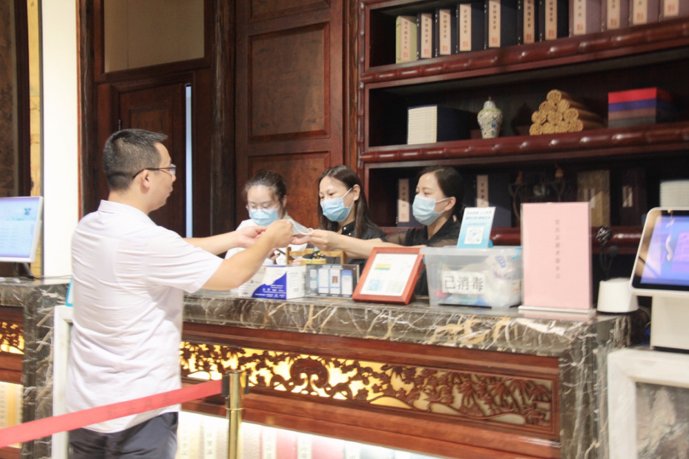 長樂客棧大堂作為旅客辦理入住和退房的公共區(qū)域,客流量較大,屬于疫情防控的第一道關(guān)口。為做好來店人員排查和信息登記工作,志愿者們充分發(fā)揮黨員帶頭作用,同前廳大堂工作人員一道對來店旅客進行檢測體溫、查驗蘇康碼和行程碼以及發(fā)放口罩,第一時間向旅客們宣傳疫情防控有關(guān)注意事項。