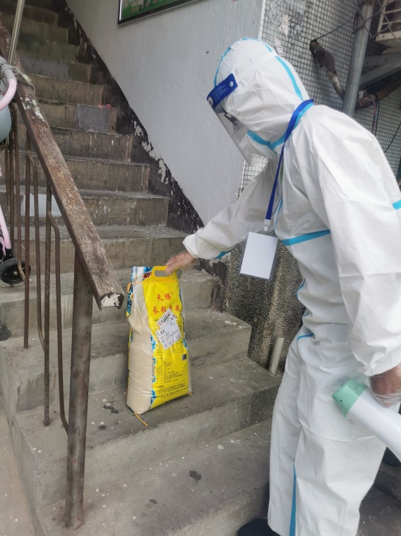 替居民運(yùn)送物資也是志愿者們每日的重要工作,那么多居民居家隔離,不準(zhǔn)外出,菜哪里來?米哪里來?志愿者們承擔(dān)了居民樓棟間的送貨員?!?1棟205,早飯給你放在樓梯口臺(tái)子上了,請下來拿一下!”“喂,你好是23棟403的劉**啊?你家的大米到了,放在樓梯口了,請自取一下!”