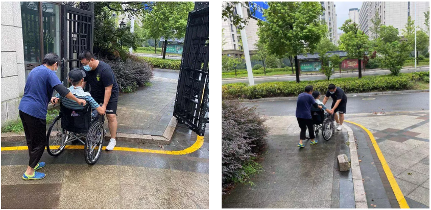 除此之外,我們的工作人員在第一次核酸檢測時(shí)就注意到了一戶特別的家庭——一位老奶奶推著坐在輪椅上的老爺爺來做核酸檢測。經(jīng)了解,原來是京杭融園10號樓的一戶業(yè)主,兩位老人家都已經(jīng)70多歲,子女不在身邊,平時(shí)就老兩口住,老爺爺需要依靠輪椅才能出行。接到第一次核酸的通知,老奶奶就趕緊推著老爺爺下樓了,一路靠過往的鄰居幫忙下臺階、上臺階,趕到了檢測點(diǎn)。發(fā)現(xiàn)這個(gè)情況后,京杭融園的物業(yè)工作人員趕緊行動(dòng)起來,每次核酸檢測時(shí),都會安排一名工作人員等在10號樓的單元門口,等他們下電梯,一路護(hù)送他們到核酸檢測點(diǎn),結(jié)束后再送回單元門口,從第二次到第九次,一次都沒有落下過。