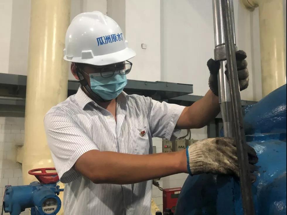 瓜洲原水廠位于長江瓜洲段,目前每天從長江抽取原水近20萬噸,原水主供第四水廠?!耙咔槠陂g一定要比平時多巡檢,每個設(shè)備都不要漏掉,2號機(jī)組壓蓋不緊,還得再緊緊?!眳强е嘟M人員邊說邊走到機(jī)泵前,一邊檢查機(jī)組的溫度,一邊用手里的扳手緊著壓蓋螺絲。巡查完設(shè)備又去巡查取水口,在江邊取完水樣后,他繼續(xù)沿著取水口大堤走去,他仔細(xì)檢查了35KV進(jìn)線設(shè)備的運(yùn)行情況?!耙咔槠陂g,安全運(yùn)行和隱患排查更應(yīng)該格外小心,需要常常去檢查。”吳俊對組員說。