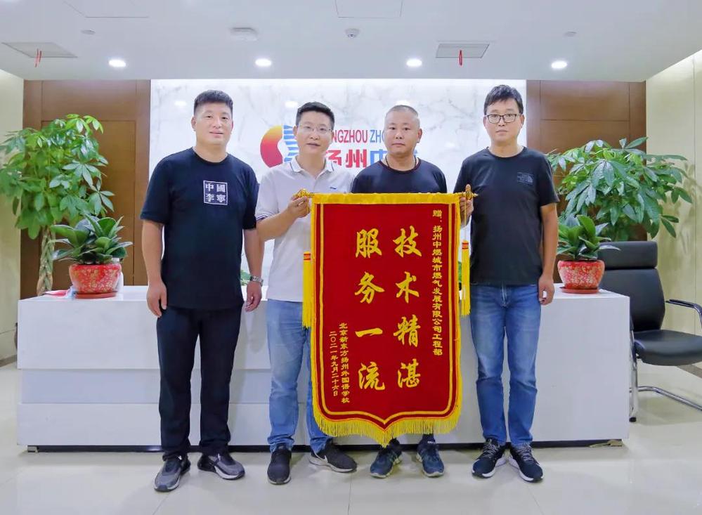 9月28日上午,新東方揚州外國語學校中學部膳食中心主任高乃軍一行來到揚州中燃,向公司贈送了一面“技術精湛,服務一流”錦旗,以表達對揚州中燃公司克服諸多困難,保障學校師生安全用氣的感激之情。