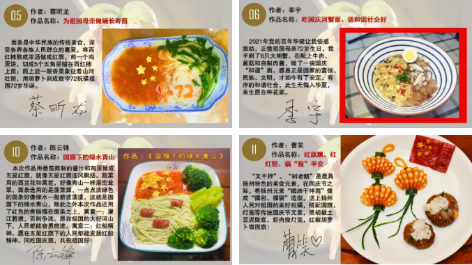 職工以家庭為單位,作品以面條為主,要求自己親手烹飪制作,成果以照片形式展現(xiàn),作者需為自己的作品命名,并附上對(duì)菜品特殊寓意的注解和對(duì)祖國(guó)的美好期愿與祝福。截至活動(dòng)結(jié)束,共收到14個(gè)職工家庭的作品。10月9日,由公司領(lǐng)導(dǎo)班子成員組成的評(píng)委小組對(duì)作品進(jìn)行了評(píng)審,共評(píng)出一二三等獎(jiǎng)各1名。