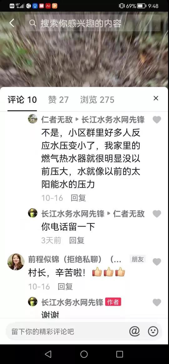 “水網(wǎng)先鋒”立即轉(zhuǎn)換私信“仁者無敵”,并留下聯(lián)系電話,不一會,“仁者無敵”就把電話打過來了,他介紹自己姓趙,住在念香苑38幢頂樓,以前水壓正常,自去年底小區(qū)改造后,樓上水壓明顯感覺小,但還能維持家用?!八W(wǎng)先鋒”隨即向技術(shù)人員了解,得知念香苑小區(qū)在去年底小區(qū)改造時并沒有對自來水管道進(jìn)行改造,而是改造的下水管道。搶維修中心及時向“仁者無敵”做了詳細(xì)解釋,并幫網(wǎng)友將水壓小的問題反應(yīng)到公司職能部門處理,得到“仁者無敵”的高評,他說無意中刷抖音刷到“水網(wǎng)先鋒”抖音號的,沒想到留言立即得到了耐心的回復(fù),非常感激。