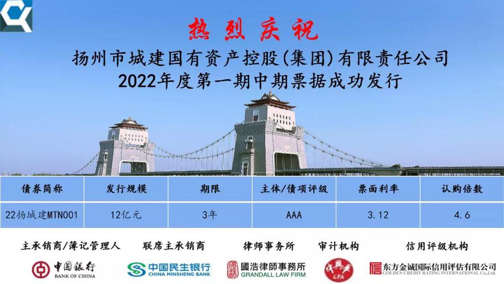 1月11日,城控集團(tuán)2022年第一期12億元中期票據(jù)成功簿記發(fā)行,期限3年,獲市場(chǎng)4.6倍超額認(rèn)購(gòu),最終票面利率3.12%,創(chuàng)揚(yáng)州城控集團(tuán)同期限債券產(chǎn)品發(fā)行利率新低,這充分體現(xiàn)出資本市場(chǎng)對(duì)集團(tuán)發(fā)展的高度認(rèn)可,也為集團(tuán)提升資本市場(chǎng)形象再續(xù)新篇。