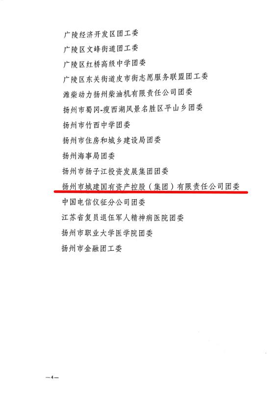 2022年是中國共青團(tuán)成立100周年。近日,揚(yáng)州團(tuán)市委印發(fā)了《關(guān)于對2021年度揚(yáng)州市“五四紅旗團(tuán)委”“五四紅旗團(tuán)支部”“新長征突擊手”“優(yōu)秀共青團(tuán)干部(團(tuán)支部書記)”“優(yōu)秀共青團(tuán)員”予以表揚(yáng)的通報》(揚(yáng)團(tuán)委發(fā)〔2022〕6號),城控集團(tuán)團(tuán)委被授予2021年度揚(yáng)州市“五四紅旗團(tuán)委”稱號。