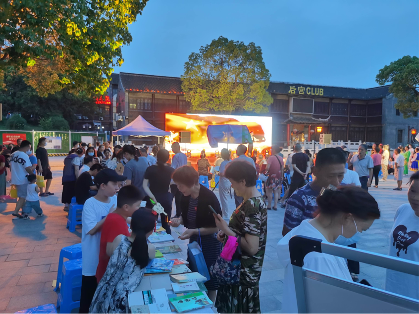 夜幕徐徐降臨,康山文化園北廣場燈光璀璨、人聲鼎沸,活動正式拉開帷幕?;顒蝇F(xiàn)場布置了書籍義賣、書畫描繪、舞蹈表演等多種活動形式。