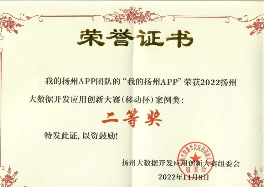 數(shù)據(jù)浪潮涌,揚(yáng)帆正當(dāng)時(shí)。11月8日上午,由揚(yáng)州市政府辦公室(大數(shù)據(jù)管理局)、揚(yáng)州市工業(yè)和信息化局聯(lián)合主辦,中國(guó)移動(dòng)揚(yáng)州分公司承辦的2022移動(dòng)杯揚(yáng)州大數(shù)據(jù)開(kāi)發(fā)應(yīng)用創(chuàng)新大賽頒獎(jiǎng)儀式順利舉行,“我的揚(yáng)州APP”獲大賽案例類賽道二等獎(jiǎng)。