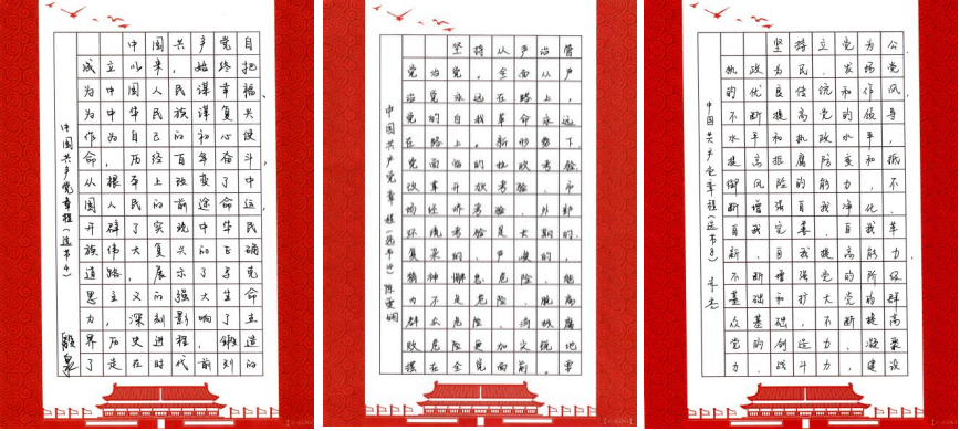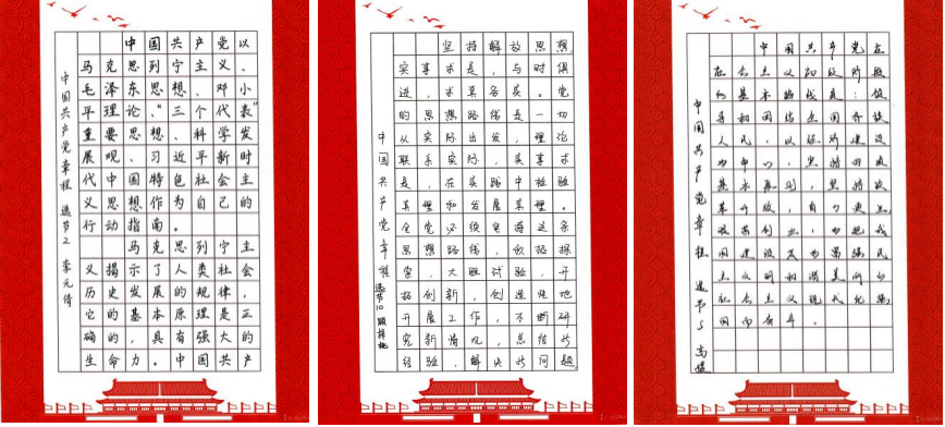 文字入手、意識入腦、責任入心。支部黨員利用工作之余,以《中國共產(chǎn)黨章程(修正案)》為藍本,堅持一筆一畫工整書寫黨章,一字一句銘記黨章條款,熟悉掌握黨章主要內(nèi)容,深入領(lǐng)會黨章內(nèi)涵、精神實質(zhì)以及對共產(chǎn)黨員的職責要求。全體黨員抄黨章、學黨章、悟黨章,內(nèi)外一心,共同在抄寫中提升黨性,鑄造黨魂。