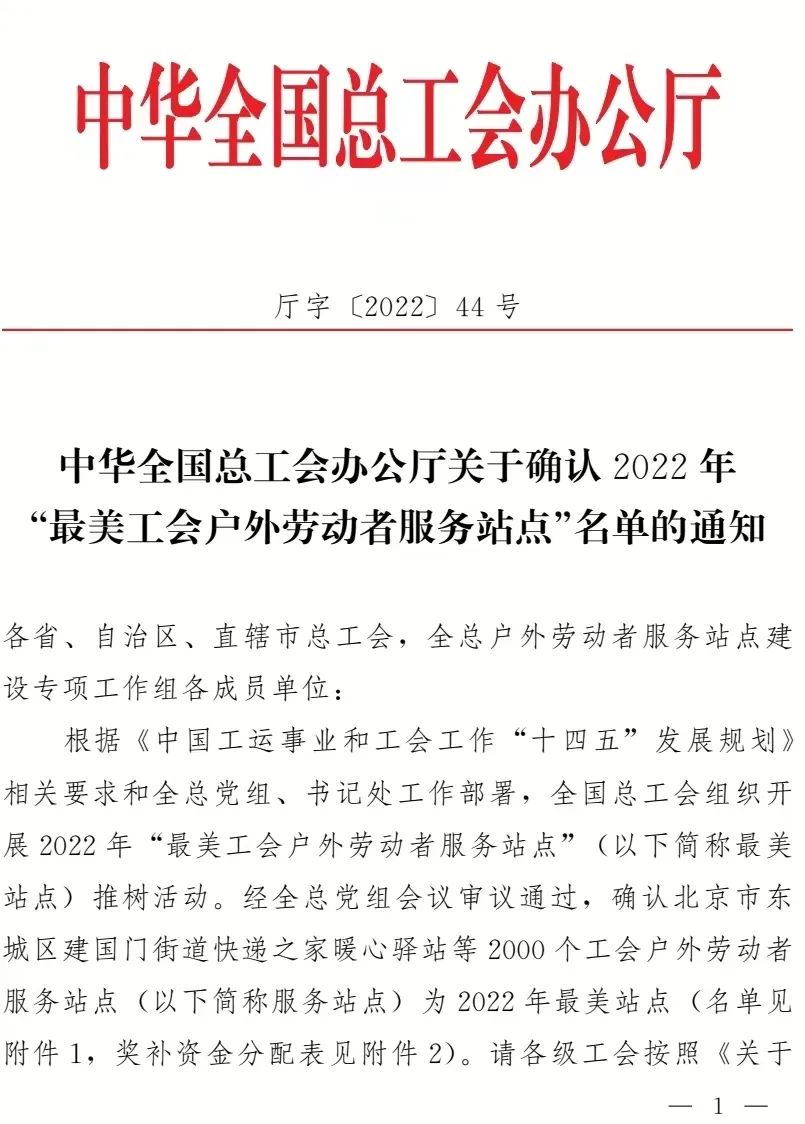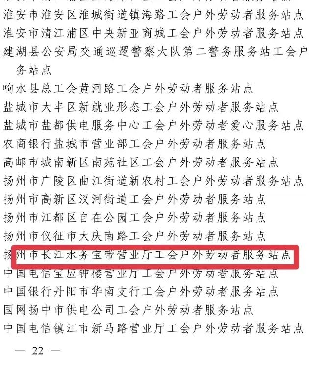 近日,中華全國總工會(huì)辦公廳發(fā)布2022年“最美工會(huì)戶外勞動(dòng)者服務(wù)站點(diǎn)”名單,城控集團(tuán)公用事業(yè)服務(wù)中心——長江水務(wù)寶帶營業(yè)廳工會(huì)戶外勞動(dòng)者服務(wù)站點(diǎn)名列其中,這是揚(yáng)州市總工會(huì)建設(shè)產(chǎn)業(yè)系統(tǒng)唯一一家入選的服務(wù)站點(diǎn)。