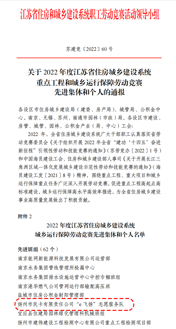 近日,江蘇省住房和城鄉(xiāng)建設(shè)系統(tǒng)職工勞動競賽活動領(lǐng)導(dǎo)小組發(fā)布《關(guān)于2022 年度江蘇省住房城鄉(xiāng)建設(shè)系統(tǒng)重點(diǎn)工程和城鄉(xiāng)運(yùn)行保障勞動競賽先進(jìn)集體和個人的通報(bào)》,市民卡公司“e 飛揚(yáng)”志愿服務(wù)隊(duì)被授予“2022 年度江蘇省住房城鄉(xiāng)建設(shè)系統(tǒng)城鄉(xiāng)運(yùn)行保障勞動競賽先進(jìn)班組”光榮稱號。