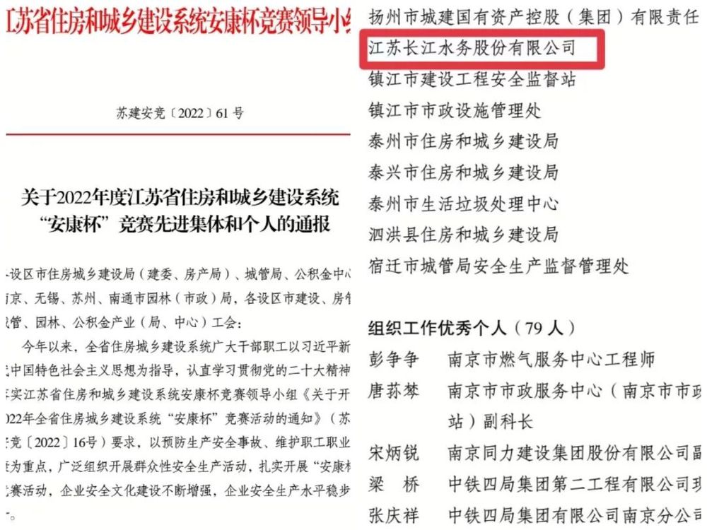 近日,省住建系統(tǒng)安康杯競(jìng)賽領(lǐng)導(dǎo)小組下發(fā)表彰通報(bào),長江水務(wù)公司榮獲2022年度江蘇省住房和城鄉(xiāng)建設(shè)系統(tǒng)“安康杯”競(jìng)賽組織工作優(yōu)秀單位稱號(hào)。