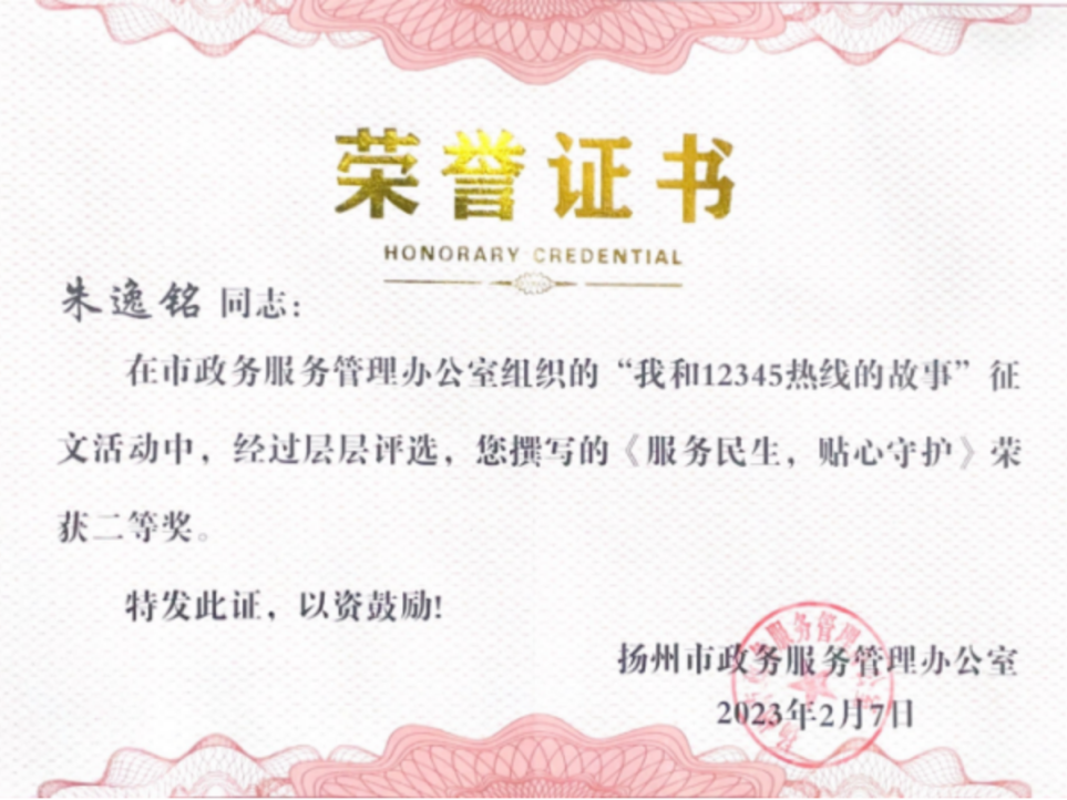 近日,揚(yáng)州市政管網(wǎng)有限公司選送的文章《服務(wù)民生、貼心守護(hù)》在揚(yáng)州市政務(wù)服務(wù)管理辦公室組織的“我和12345的故事”征文活動中,經(jīng)過層層評選,榮獲二等獎。