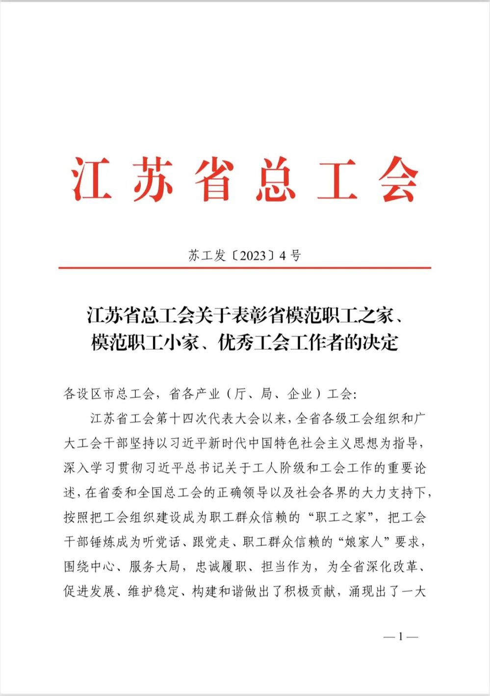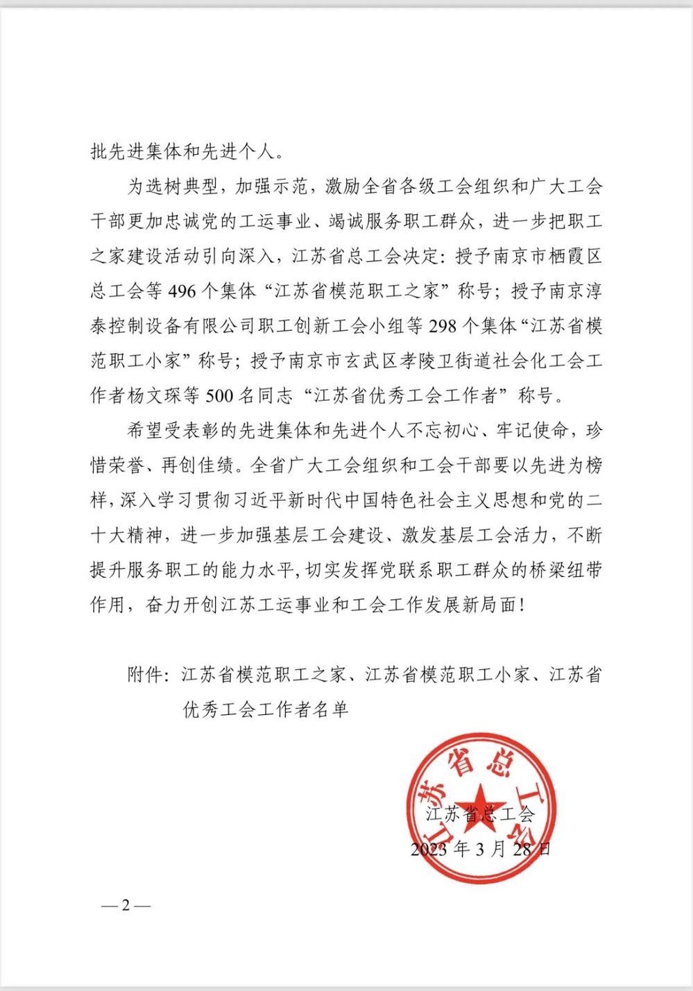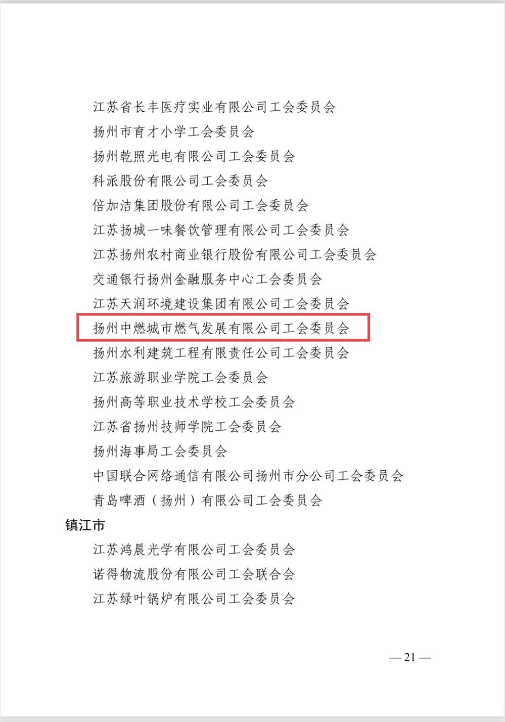 2023年4月19日,江蘇省工會第十五次代表大會在南京勝利閉幕。大會對省五一勞動獎狀和省工人先鋒號、省五一勞動獎?wù)?、省模范職工之家等先進集體和個人進行表彰,揚州中燃公司工會被授予“省模范職工之家”光榮稱號。