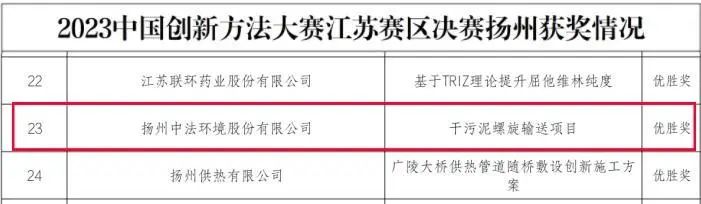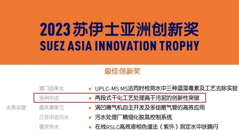 近日,揚(yáng)州中法環(huán)境“兩段式干化工藝處理高含固率污泥”項(xiàng)目因創(chuàng)新程度高、實(shí)用性強(qiáng)等特點(diǎn)獲得了中國創(chuàng)新方法大賽優(yōu)勝獎(jiǎng)和2023年度蘇伊士亞洲最佳創(chuàng)新獎(jiǎng)。