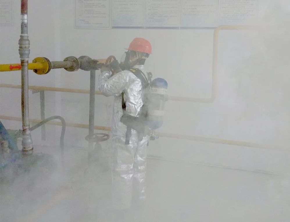 第二階段演練模擬壓縮機(jī)房發(fā)生泄漏。演練人員先切斷所有電源,關(guān)閉閥門,疏散無關(guān)人員。上報(bào)公司后,組織人員迅速穿戴防護(hù)服與正壓式呼吸器進(jìn)入現(xiàn)場(chǎng),在判定為法蘭連接處為泄漏點(diǎn)后,使用不發(fā)火工具,對(duì)泄漏部位進(jìn)行搶修,再使用可燃?xì)怏w檢漏儀對(duì)泄漏點(diǎn)進(jìn)行檢查,確保無泄漏。