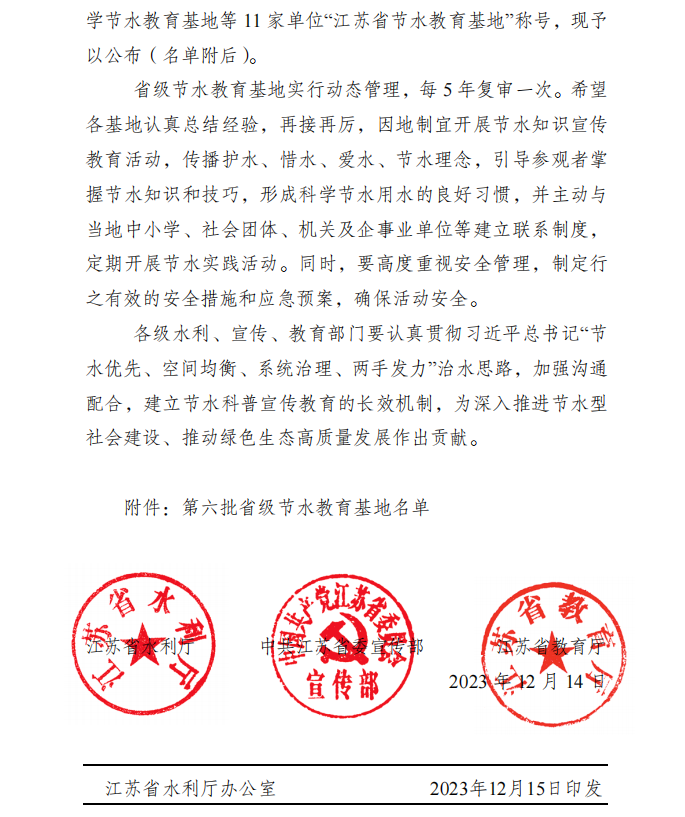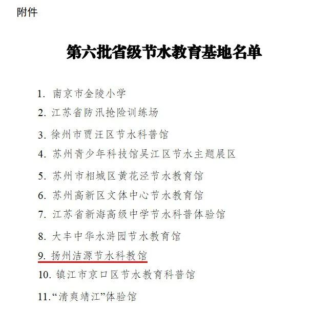 近日,由省水利廳、省委宣傳部和省教育廳聯(lián)合發(fā)文,揚州潔源節(jié)水科教館順利通過評選驗收,成功入選第六批省級節(jié)水教育基地。