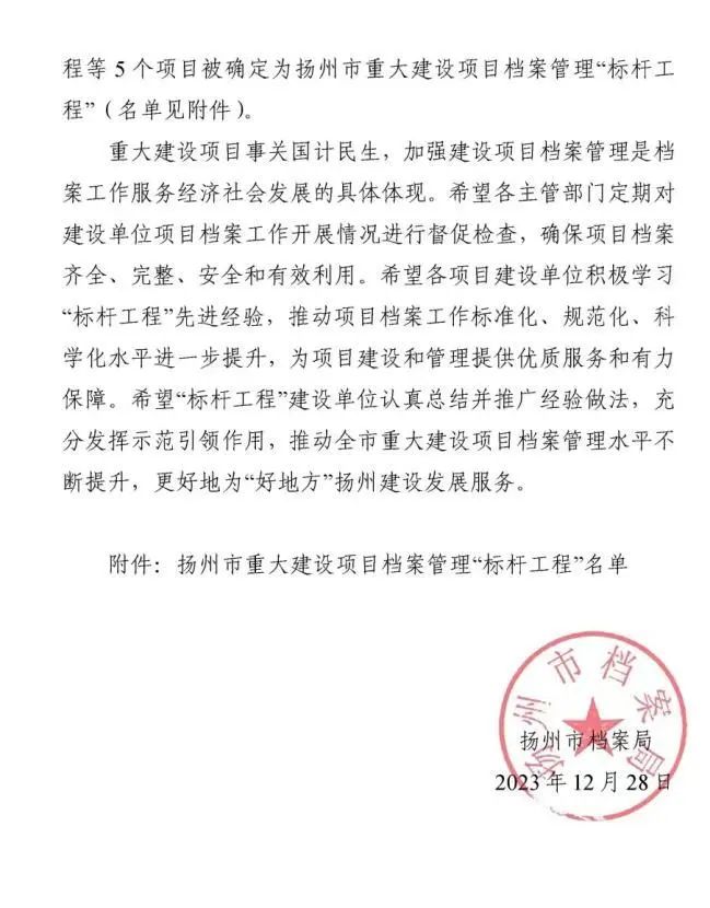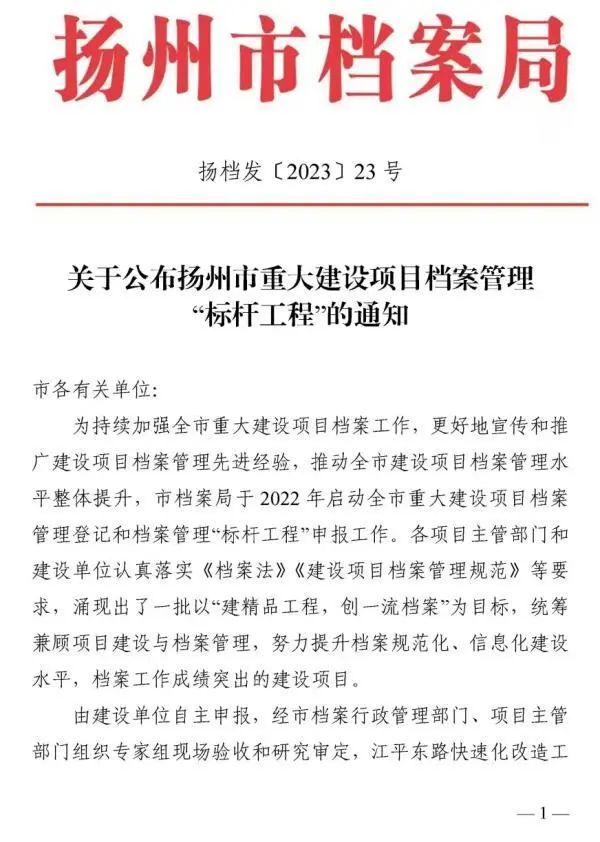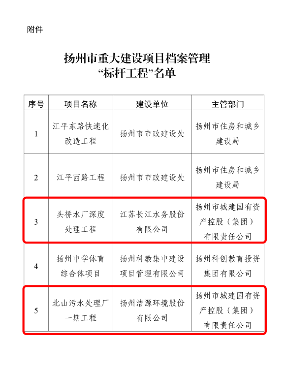 近日,市城控集團(tuán)頭橋水廠深度處理工程項(xiàng)目、北山污水處理廠一期工程榮獲揚(yáng)州市檔案局頒布的揚(yáng)州市重大建設(shè)項(xiàng)目檔案管理“標(biāo)桿工程”榮譽(yù)稱號(hào)。