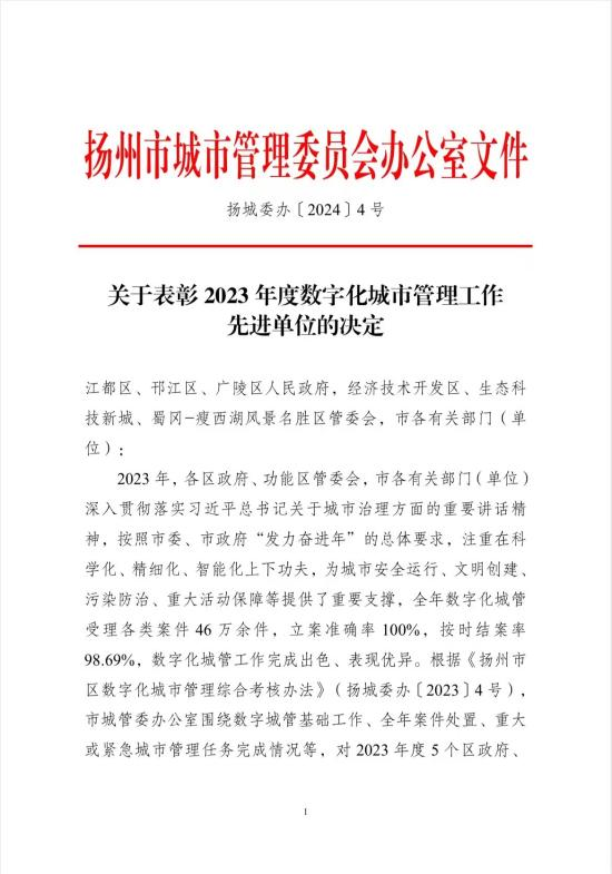 近日,揚(yáng)州市城市管理委員會(huì)辦公室發(fā)布《關(guān)于表彰2023年度數(shù)字化城市管理工作先進(jìn)單位的決定》,城控集團(tuán)榮獲“2023年度數(shù)字化城市管理工作先進(jìn)單位”一等獎(jiǎng)。