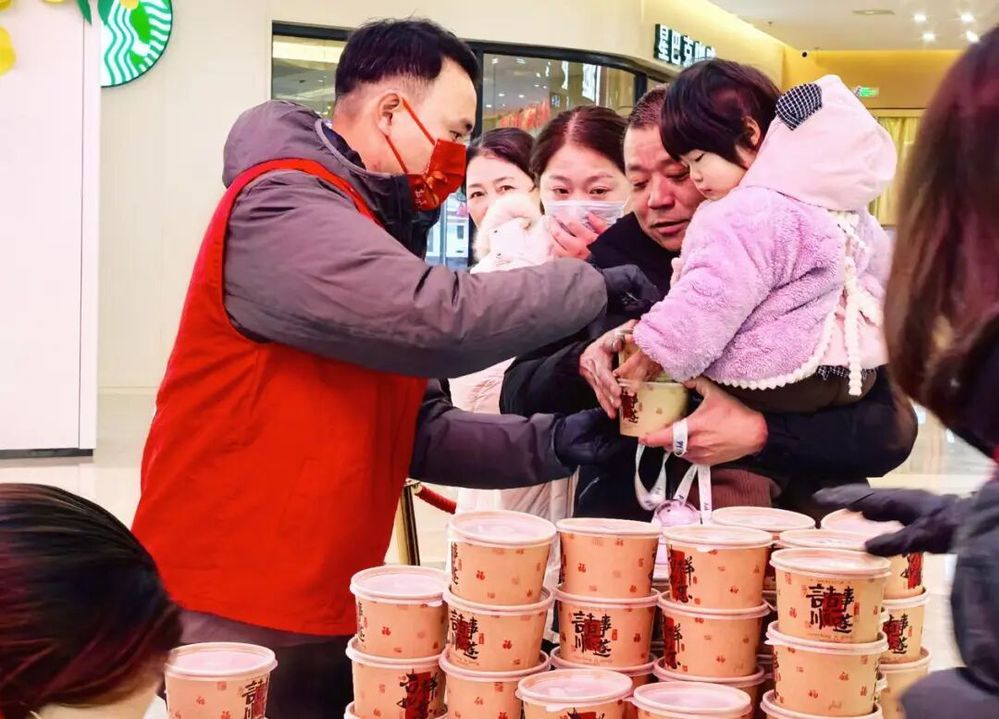 早上十點(diǎn)商場(chǎng)開(kāi)門(mén)迎客,中庭活動(dòng)區(qū)已布置妥當(dāng)。志愿者們?cè)缭绲綅?,將連夜熬制的數(shù)百份臘八粥細(xì)心分裝。粥品選用優(yōu)質(zhì)雜糧,經(jīng)過(guò)數(shù)小時(shí)文火慢燉,軟糯香甜?;顒?dòng)開(kāi)始后,商場(chǎng)工作人員熱情地將一碗碗盛滿(mǎn)暖意的臘八粥遞到顧客手中,現(xiàn)場(chǎng)秩序井然,充滿(mǎn)歡聲笑語(yǔ)。